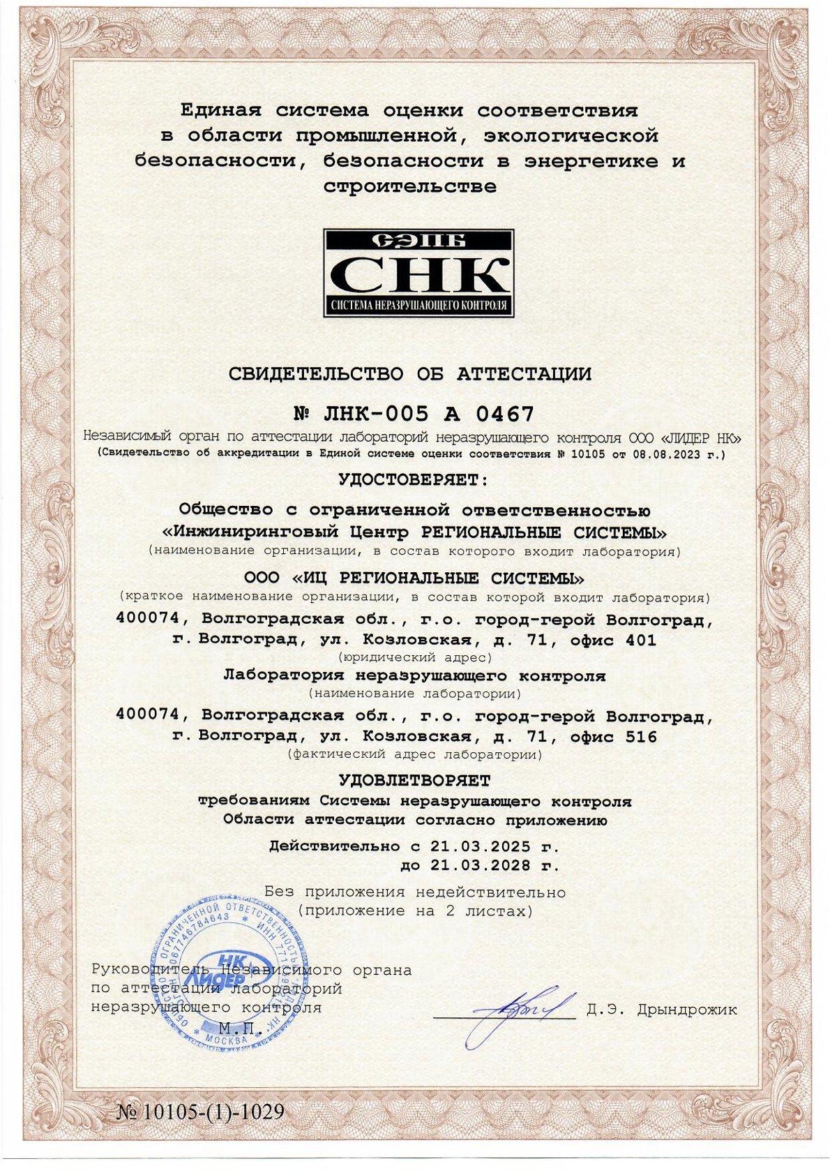 Свидетельство об аттестации Лаборатории неразрушающего контроля ЛНК-005А 0467 от 21.03.2025/ Срок действия до21.03.2028 г.