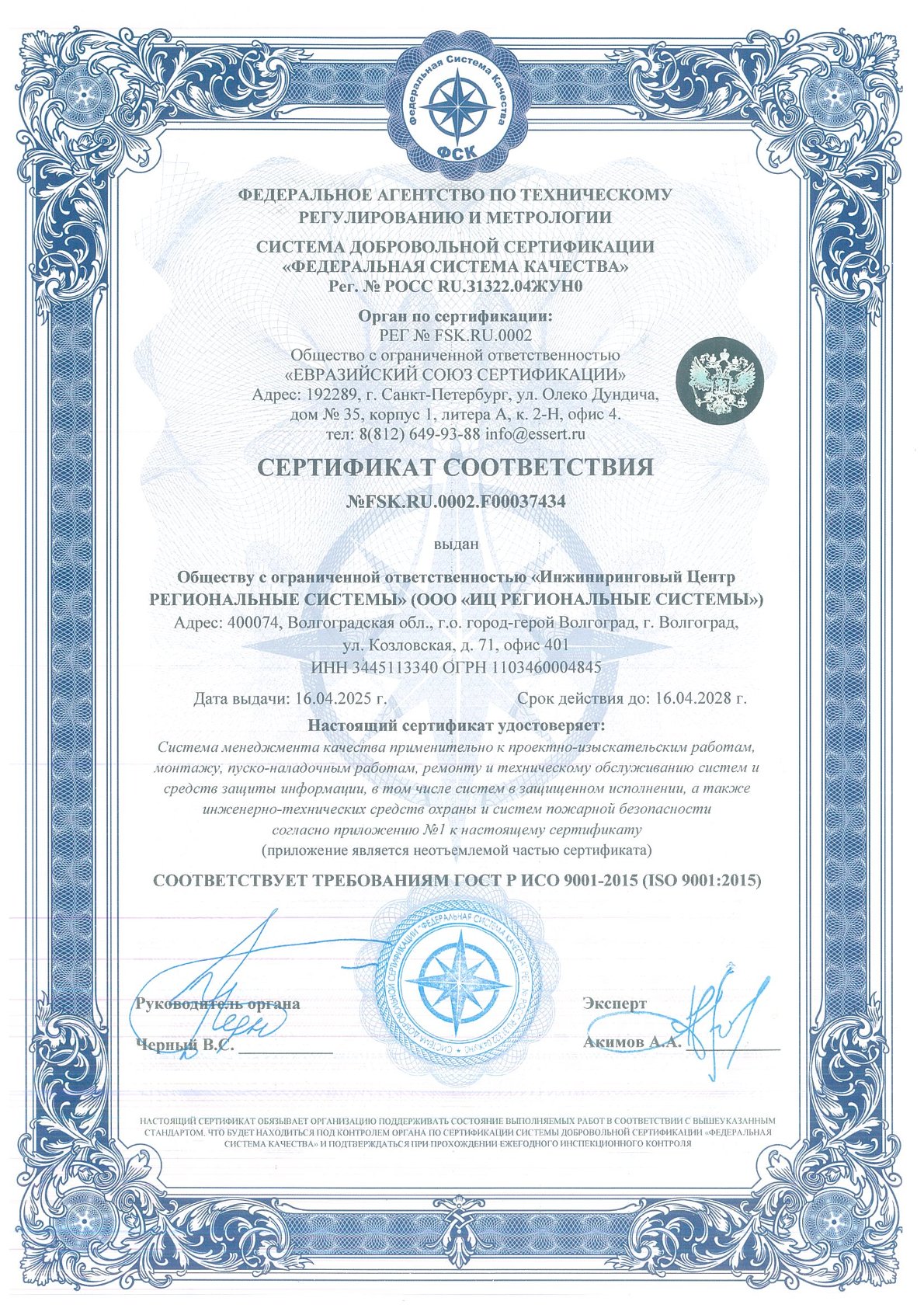 Сертификат соответствия FSK.RU.EXP.000037434 (срок действия — 16.04.2028 г.)